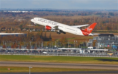 11月28日,英国维珍航空携带100%可持续航空燃料的波音787客机从英国伦敦的希思罗机场起飞。