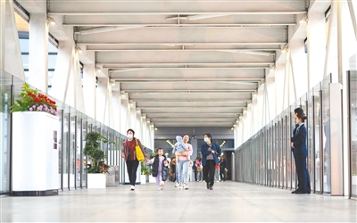 据了解,项目新建了6个廊桥,一头连接着轮船,另一头连接着综合交通枢纽大楼,旅客过海可以从凉爽的大楼内部出发,通过廊架直达船上。