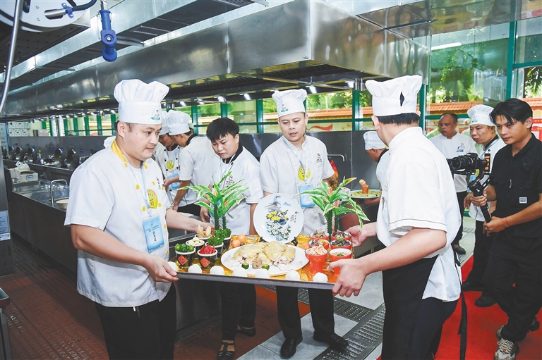 11月29日,2023年首届“文昌鸡师傅”劳务品牌大赛在文昌举行,图为选手参加烹饪大赛的比赛。大赛以“展示非遗技艺·助力产业发展”为主题,设置烹饪大赛、养殖大赛两项比赛,参加人数超400人。此次活动旨在进一步深入挖掘文昌鸡产业人才资源,推动文昌鸡特色产业高质量创新发展。