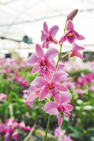 经过团队的一番努力,一种名为“热科迷你”小型兰花问世。花如其名,这种兰花十分小巧,植株高不超过25厘米,花瓣呈紫红色。它的分芽能力特别强,一株即是一盆,花开繁茂之景如蝴蝶满枝,令人赏心悦目。