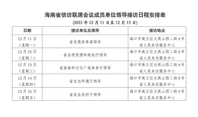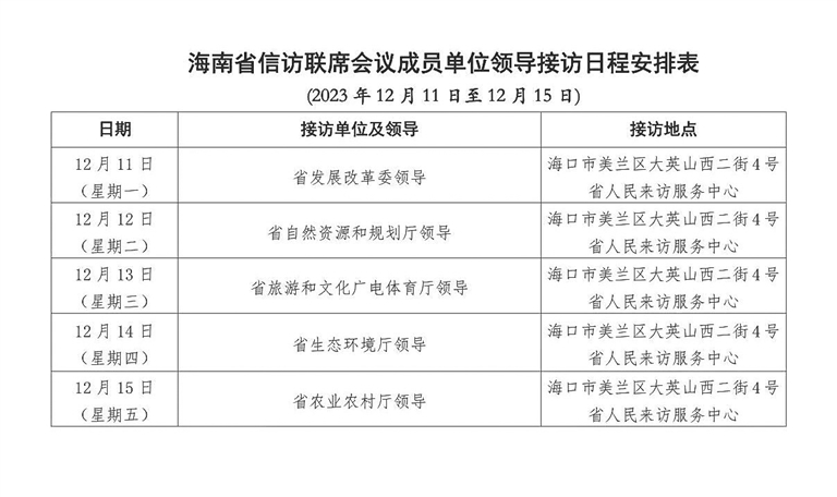 根据安排,12月11日至15日,省发展改革委、省自然资源和规划厅、省旅游和文化广电体育厅、省生态环境厅、省农业农村厅相关负责人将分别于海南省海口市美兰区大英山西二街4号“海南省人民来访服务中心”接访群众。