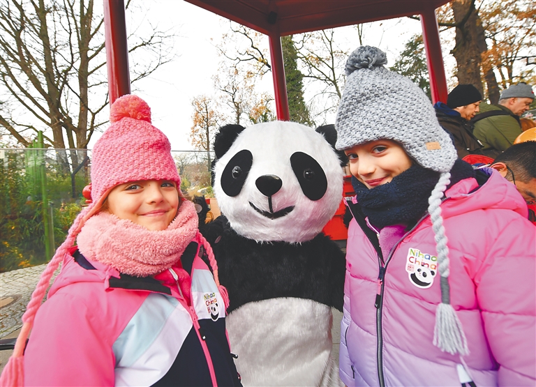 12月8日,在德国柏林动物园,小朋友和大熊猫人偶合影。