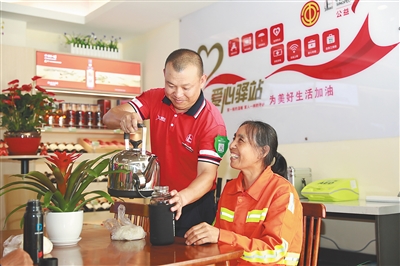 杜花芳是负责海口南海大道一带道路卫生的一名环卫工人。每当工作累的时候,她总是习惯到中石化海口药谷北加油站的“爱心驿站”里歇歇脚。“不管冬天还是夏天,我们都喜欢来这儿,有热水,也能热饭,员工们都很热情。”