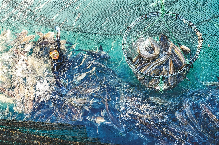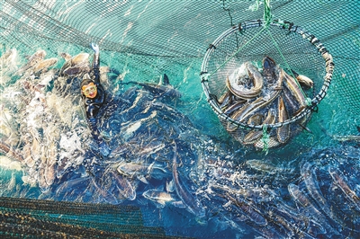 1月5日,乐东龙栖湾海洋牧场深远海养殖10个月的军曹鱼迎来收获,300万斤渔获将销往上海、南京等地。投产3年多来,乐东龙栖湾海洋牧场的深海养殖平台已增加至3个,并致力于改善海洋生态功能、提高渔业产量、打造休闲渔业等新业态,谱出了一曲海南渔业转型发展的“新渔歌”。本报记者 王程龙 摄