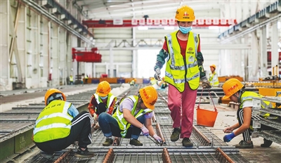 1月19日,在位于临高金牌港开发区的中铁建设建筑发展(海南)有限公司装配式建筑生产车间内,工人们正在生产装配式建筑构件。