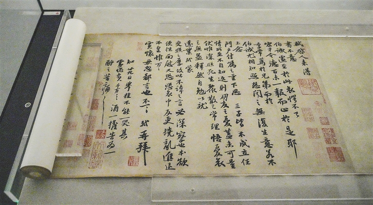 据了解,目前包括“宋四家”真迹在内的21件来自故宫博物院的文物均已到位。在展馆里,记者首先看到了“宋四家”中最年长的一位——蔡襄的真迹《京居帖》。此帖是蔡襄写给友人的一封问候信札,前半部分以行书为主,后半部分逐渐转为草书,用笔清隽秀润,体势自然流动,兼有王羲之和颜真卿之风,集中反映了蔡襄在这两种书体上的高超造诣。