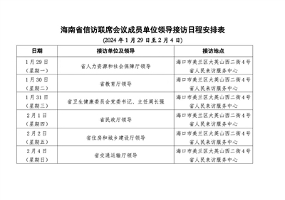 本报海口1月27日讯 (记者陈蔚林 通讯员肖优林)1月27日,省信访局发布了省直属单位领导1月29日至2月4日接访日程安排。