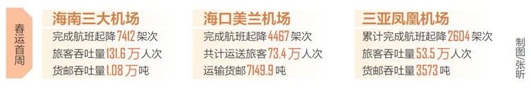 三亚凤凰机场春运首周累计完成航班起降2604架次,旅客吞吐量53.5万人次,货邮吞吐量3573吨。