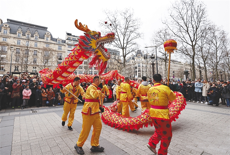 在美国纽约,中国龙形文物巨幅海报亮相时报广场,向全球人民献上新春祝福。在新西兰,总理拉克森在奥克兰参加“新春花市同乐日”活动,与当地华人共迎新春。在毛里求斯首都路易港,该国副总理胡斯努与众人敲响锣鼓,共同启动“欢乐春节”花车巡游。在法国巴黎香榭丽舍大街,长长的舞龙在龙珠引导下上下翻飞,博得阵阵喝彩。游客让-巴蒂斯特说,世界各地都在庆祝春节,因为春节带来的快乐能“感染所有人”。