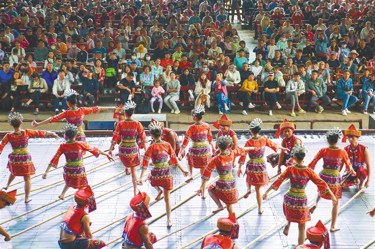2月12日,游客在保亭黎族苗族自治县槟榔谷景区欣赏《槟榔·古韵》演出。春节改版首演的《槟榔·古韵》剧场集“火龙”喷射、黎锦欢歌等沉浸式互动于一体,吸引了不少观众观看。本报记者 武威 摄