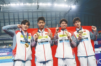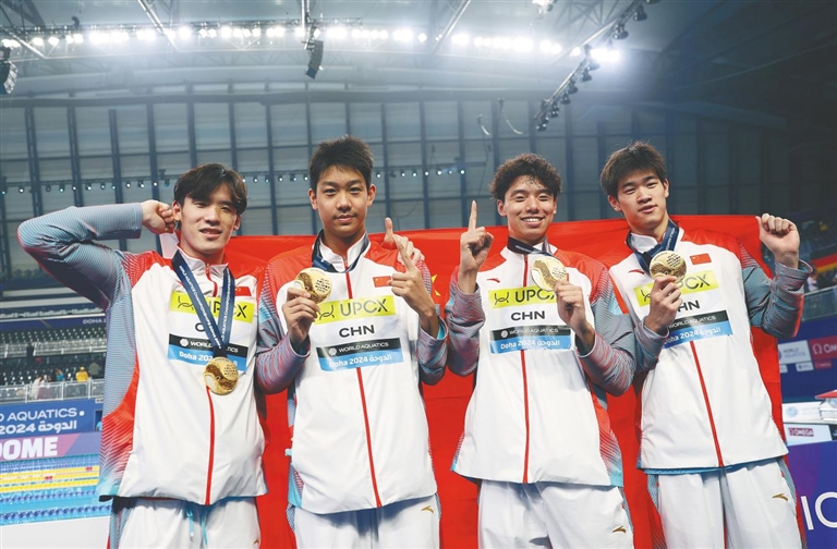 据新华社多哈2月11日电(记者刘旸 周欣 孙哲)在11日进行的2024多哈游泳世锦赛男子4×100米自由泳接力决赛中,由潘展乐、季新杰、张展硕、王浩宇组成的中国队以3分11秒08的成绩摘金。潘展乐第一棒游出46秒80的成绩,打破男子100米自由泳世界纪录。