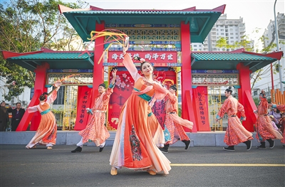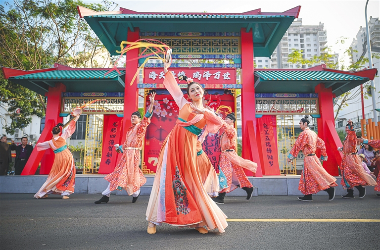 2月12日,在海口市第十六届万春会分会场——海瑞文化公园举行的春节系列活动现场,上演了精彩的舞蹈表演。新华社记者 蒲晓旭 摄