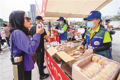 春运返程高峰期间,在海口新海滚装码头客运综合枢纽站外,志愿者为旅客发放食物。 本报记者 袁琛 摄