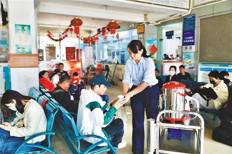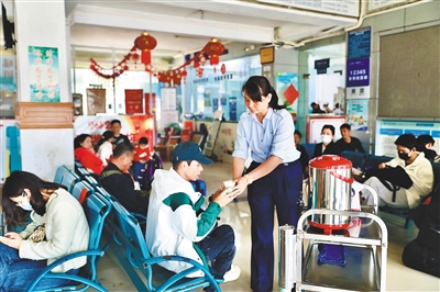 图为海口秀英港工作人员为旅客送上热姜茶。本报记者 韦茂金 摄