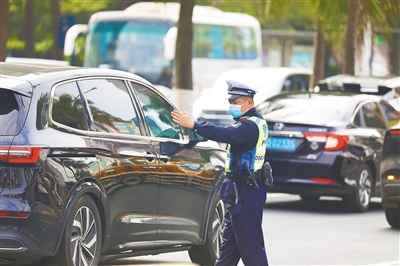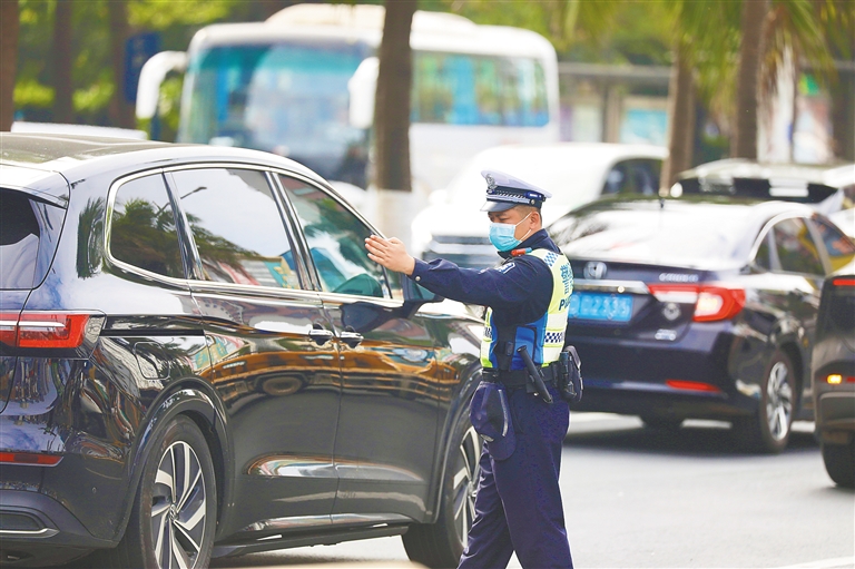 图为海口交警在秀英港周边道路疏导交通。本报记者 韦茂金 摄