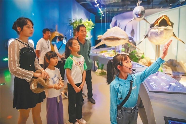 2月15日,在中国(海南)南海博物馆,来自北京师范大学万宁实验小学的8岁讲解员夏钰涵在向游客讲述海洋故事。 特约记者 蒙钟德 摄