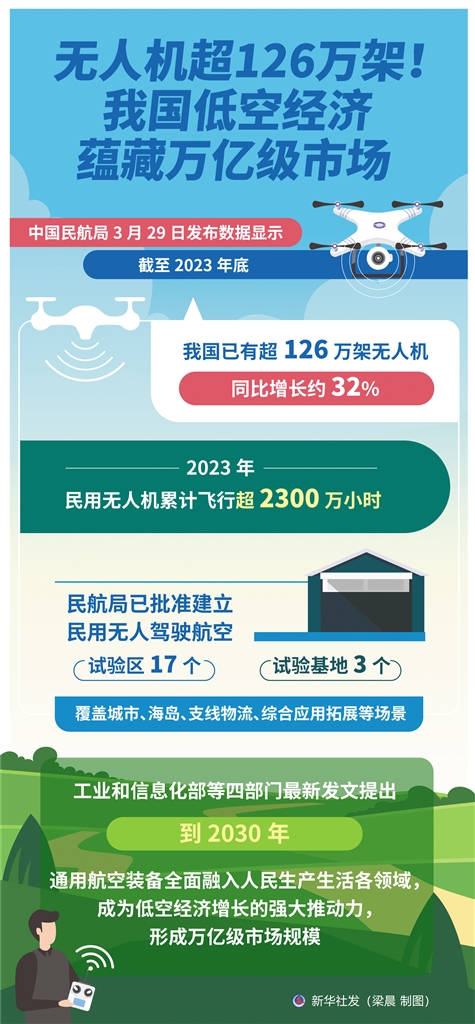 中国民航局29日发布数据显示,截至2023年底,我国已有超126万架无人机,同比增长约32%。2023年,民用无人机累计飞行超2300万小时。民航局已批准建立民用无人驾驶航空试验区17个、试验基地3个,覆盖城市、海岛、支线物流、综合应用拓展等场景。