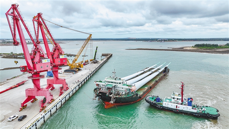 本报临城8月24日电(海南日报全媒体记者张文君)8月23日下午,在临高县金牌港东作业区码头,运载3片全球最大风轮叶片——MySE292海上超大型叶片的“鑫腾远”轮停靠泊位,随后,叶片被吊起、运送到码头广场暂时停放,将于近日送往明阳(临高)大型海上风电机组检测试验基地进行首次装机测试。