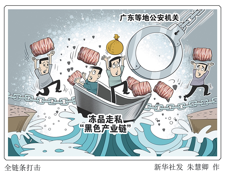 2023年9月,广东、四川、重庆、广西、北京、浙江、河南公安机关和香港警方同步收网,一举抓获包括组织者在内的涉案人员218名,捣毁走私冻库、仓库窝点21个,依法查处国内相关食品加工企业14家,查扣走私船艇26艘、冻品1300余吨。