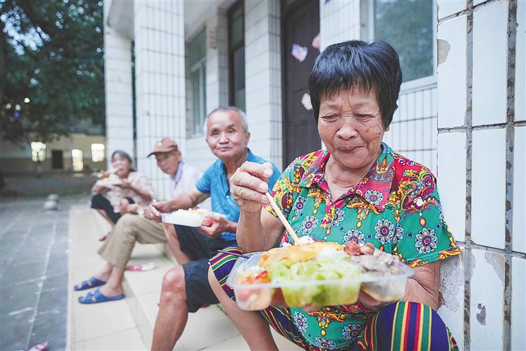 ③9月5日,在海口美兰区演丰镇中心小学安置点,北港岛村民吃上政府发放的晚餐。