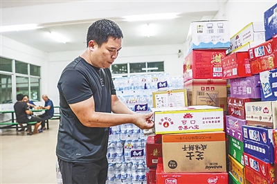 ②9月5日,工作人员在明月小学集中安置点整理物资。