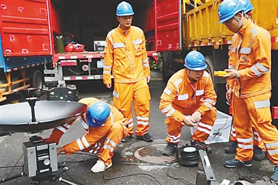 ②9月6日早上7点左右,在海口市滨海大道(海口秀英港段),排水工作人员清除雨水井的枯枝树叶加快排水。