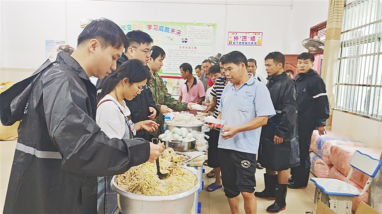 ③9月6日中午,在琼海市长坡中心学校,临时安置区的200多名群众,每人领到了一份热腾腾的饭菜。