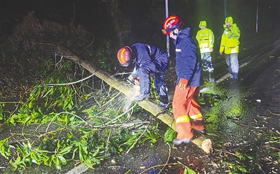 受台风“摩羯”影响,万宁地区多路段出现树木倒伏。9月6日晚,万宁消防连夜展开道路清障处置行动。 本报记者 陈元才 通讯员 卓欣欣 图/文 |
