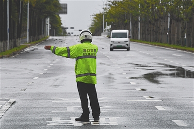 | 9月6日,交警在海口市文明东隧道外引导车辆绕行。 新华社记者 蒲晓旭 摄 |