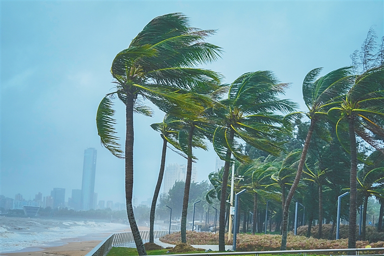 | 9月6日,超强台风“摩羯”来袭,海口西海岸出现狂风骤雨,成排的椰子树被风压弯了“腰”。海南日报全媒体记者 张茂 摄 |