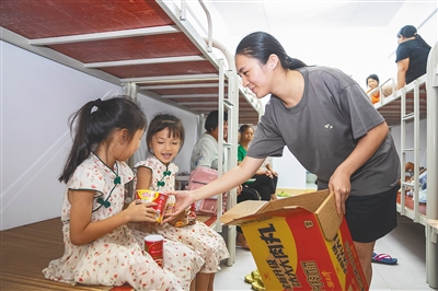 | 9月6日,在琼海市潭门中学,安置点工作人员发放泡面等物资。海南日报全媒体记者 李天平 摄 |