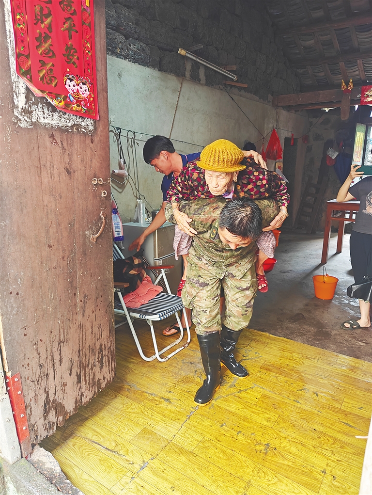 | 9月6日,海口市秀英区石山镇,专武干部背上行动不便的老人进行转移。 (省军区供图) |
