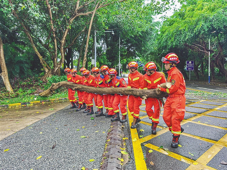 | 9月6日14时许,三亚消防多名救援人员将被风吹倒的树进行切割,并移至路边安全区域。三亚消防供图 |