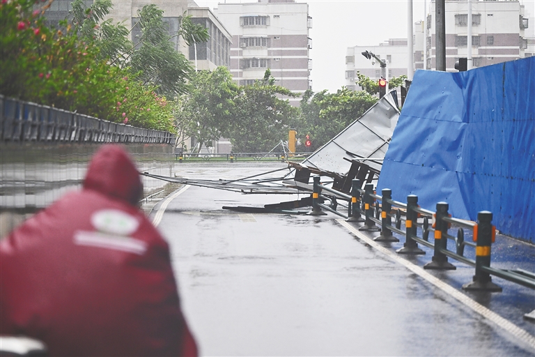 | 9月6日,海口市大英山东二街一处工地的挡板被风吹倒。 新华社记者 郭程 摄 |