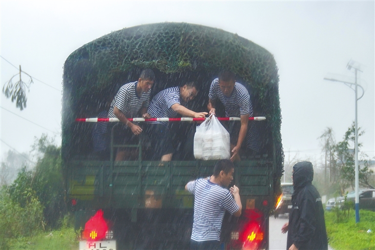 9月7日,文昌市翁田镇博文村,镇政府工作人员(右)冒雨为参与灾后重建的人民子弟兵送饭。海南日报全媒体记者 王程龙 摄