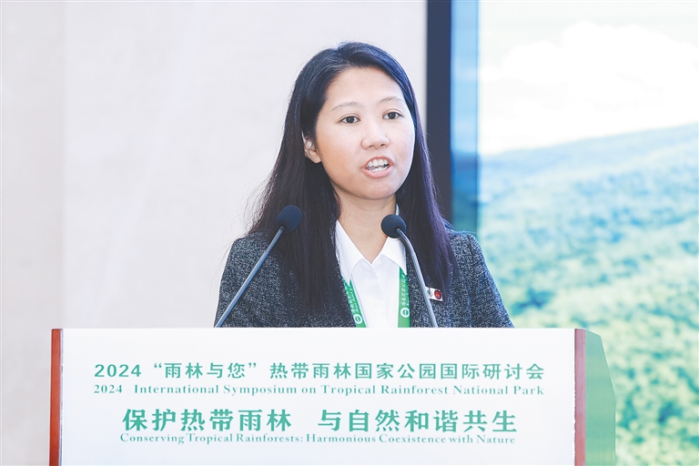 设立三年,海南全力推动海南热带雨林国家公园建设,打造国家公园的“海南样板”。11月7日,海南热带雨林国家公园管理局副局长王楠在研讨会上向来自中外的参会嘉宾,介绍了海南热带雨林国家公园设立三年来的建设成果。白沙黎族自治县副县长岳文阳与嘉宾分享白沙当地群众通过发展茶、南药、鲜切兰花等产业,与自然和谐共生,探索“两山”转化增收致富的故事,赢得掌声阵阵。