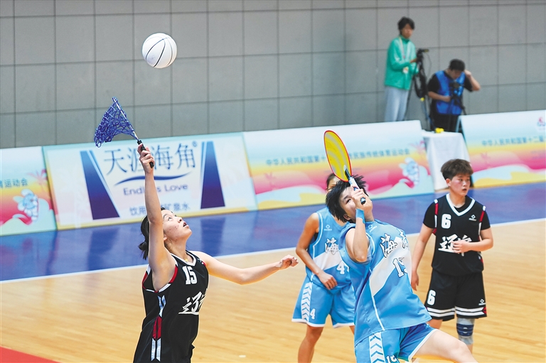 源自中国满族民间游戏“采珍珠”的珍珠球项目,兼具篮球、手球、足球以及排球等诸多运动的特点,其对抗性异常激烈。球场上,队员一个虚晃,随即快速变向突破,珍珠球在人群中灵巧穿梭。只见巴掌大小的珍珠球在空中划出一道优美的弧线,抄网手一记凌厉的侧扑,将这个关键球稳稳“收入网中”。现场比赛精彩纷呈,让观众感受到了被称为移动“小号篮球”的珍珠球的魅力,赢得观众阵阵喝彩。