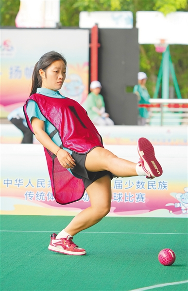 找准角度,脚跟着地,脚掌触球,用力蹴球……“好球!”海南代表团蹴球项目教练员赵倩倩在察觉到队员紧张的情绪时,不时在场下鼓励选手们。