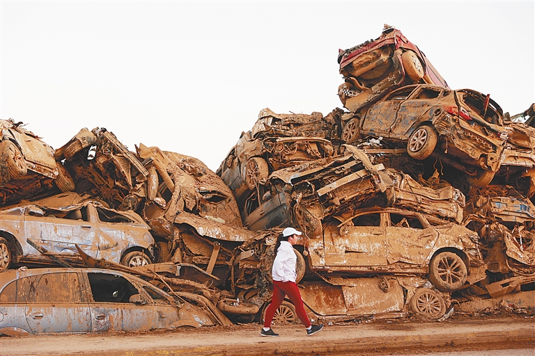 11月28日,在西班牙巴伦西亚的派波塔,一名女子经过被淤泥覆盖的破损车辆。
