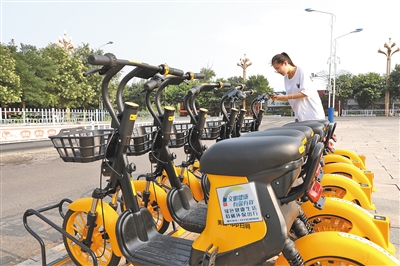 ① 市民在河北省张家口市涿鹿县街头扫码骑行共享电动车。