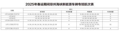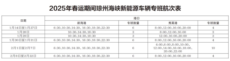 本报海口1月9日讯(海南日报全媒体记者党朝峰)1月9日,海南日报全媒体记者从海南海峡航运股份有限公司(以下简称海峡股份)获悉,2025年春运即将到来,为进一步满足琼州海峡新能源车辆过海运输需求,海峡股份将于1月14日(春运当天)起调整新能源车辆专班航次。预计的出岛高峰期2月1日(正月初四)至7日(正月初十),将每日开设16班新能源车专班。