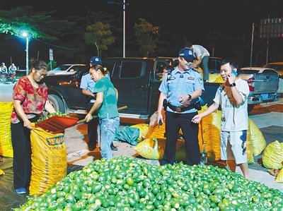 夜幕降临,华灯初上,乐东县抱由镇发展西路一带逐渐热闹起来。人流、车流络绎不绝,槟榔青果在路边堆成“小山”……红蓝交替的警灯在车流中闪烁,民警、辅警在人流中加密巡逻,守护“槟榔夜市”平安。