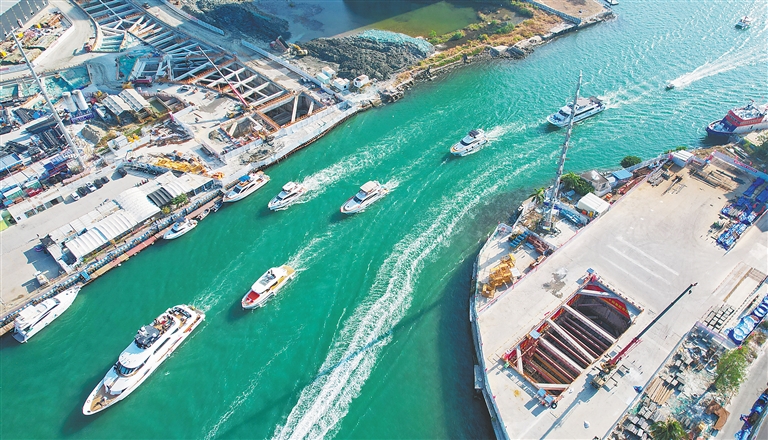 1月11日拍摄的三亚河口通道工程项目现场(无人机照片)。近期,位于三亚市天涯区的三亚河口通道工程项目加快推进施工进度,力争早日实现通车运行。该项目是三亚首个水下隧道工程,隧道总长度3.118千米,项目建成后将进一步优化三亚市空间格局。新华社记者 杨冠宇 摄