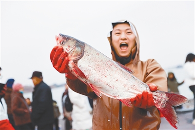 1月11日,参加捕鱼节游戏活动的观众兴奋地举起“战利品”。