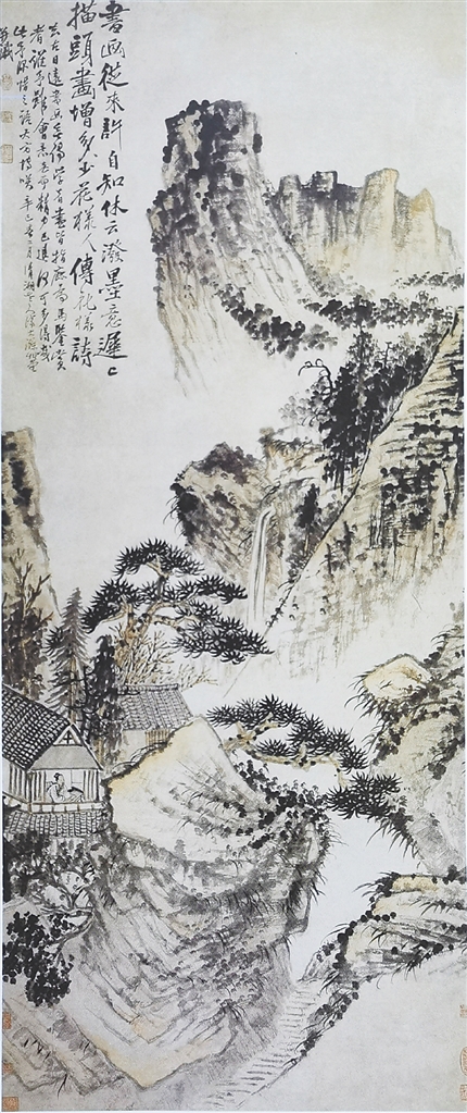 清代著名画家石涛绘有多幅以读书为题材的画作,如《山窗研读图》《松窗读易图》等。如他的一幅《松窗读易图》立轴,创作于1701年,大小为187厘米×80厘米,纸本设色,现收藏于沈阳故宫博物院。从画面看,远处山峦巍峨,树木蓊郁,近处几株松树虬枝苍翠,松针刚劲,两座瓦房就建在松树旁,其中一座瓦房开着窗,对着邻近的巨石。仔细一看,但见一高士正坐在窗旁读书,从画作的取名来看,那高士读的为《周易》。瓦房周边如此幽静的环境,实为读书的好地方,难怪那高士读书看起来如此专注。此图水墨淡色,苍蔚幽深,山清气爽,将高士读书的情景置于画中,平添画面的文气雅韵。
