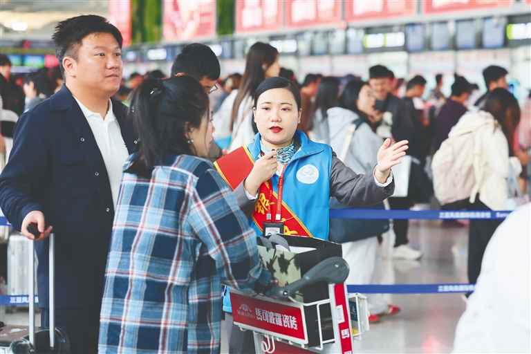 1月15日,三亚凤凰国际机场志愿者引导旅客乘机。文/海南日报全媒体记者 邵长春 图/通讯员 陈振煌 摄