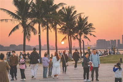 近日,海口天气晴好,不少市民游客来到海口湾尽享暖阳下的椰风海韵,欣赏落日时分海天一色的美丽风景。当下,随着全国各地的游客纷至沓来,海口旅游持续升温。海南日报全媒体记者 李天平 摄