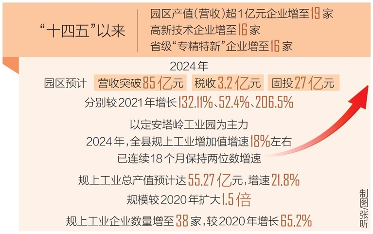 据统计,“十四五”以来,园区产值(营收)超1亿元企业增至19家,高新技术企业增至16家,省级“专精特新”企业增至16家。2024年,园区预计营收突破85亿元,税收3.2亿元,固投27亿元,分别较2021年增长132.11%、52.4%、206.5%。