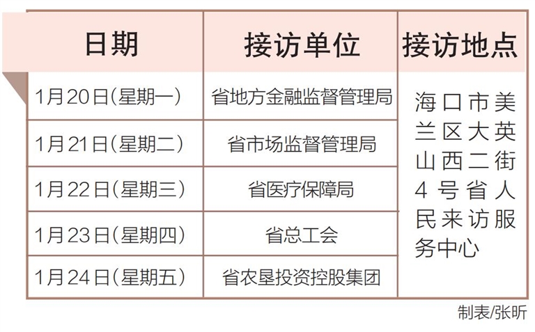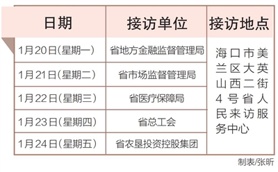 1月20日至24日,省地方金融监督管理局、省市场监督管理局、省医疗保障局、省总工会、省农垦投资控股集团相关负责人将在海口市美兰区大英山西二街4号省人民来访服务中心接访群众。