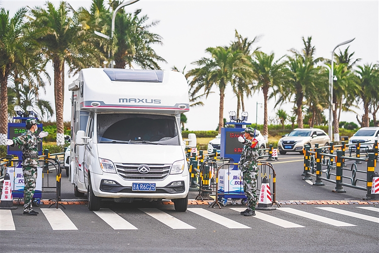 日前,在海口长滨北五路和长乐路交叉口的查验点,工作人员引导车辆通过。海南日报全媒体记者 李天平 摄